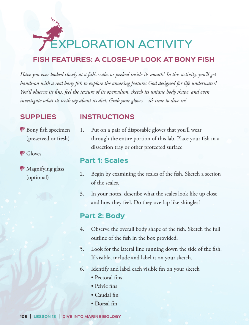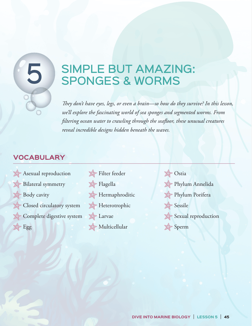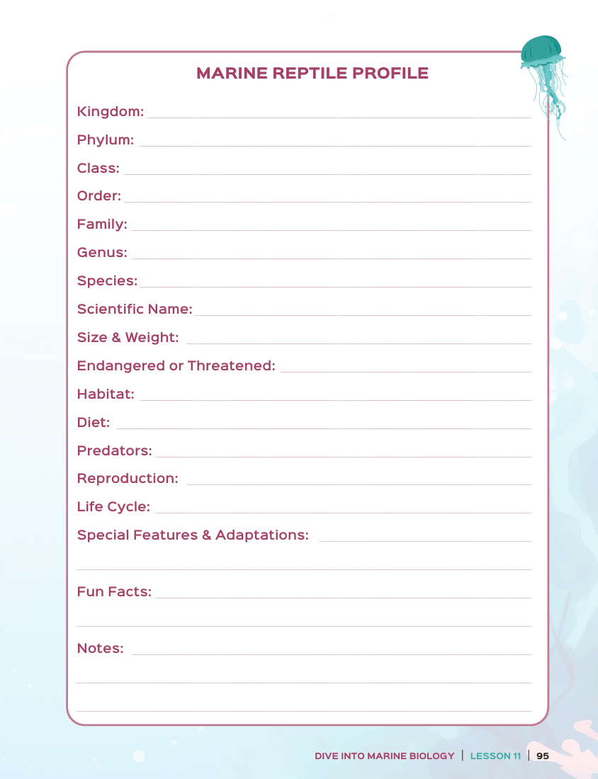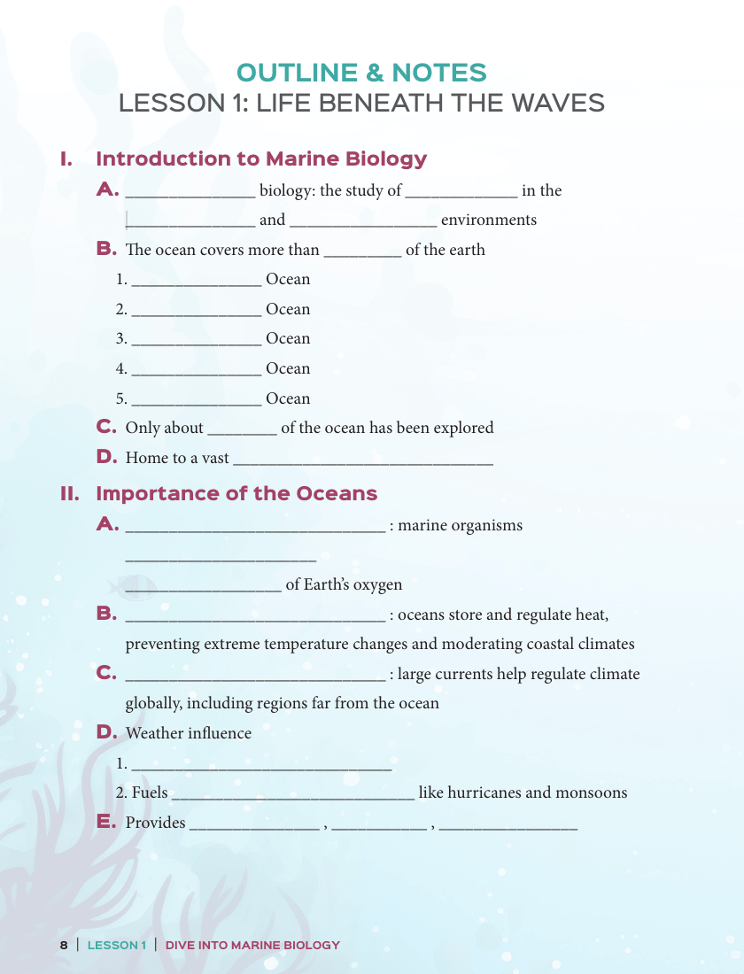 This companion guide to the Dive Into Marine Biology course includes fill-in-the-blank lecture notes for each lesson, making it easy for students follow along with the important material from the lectures.