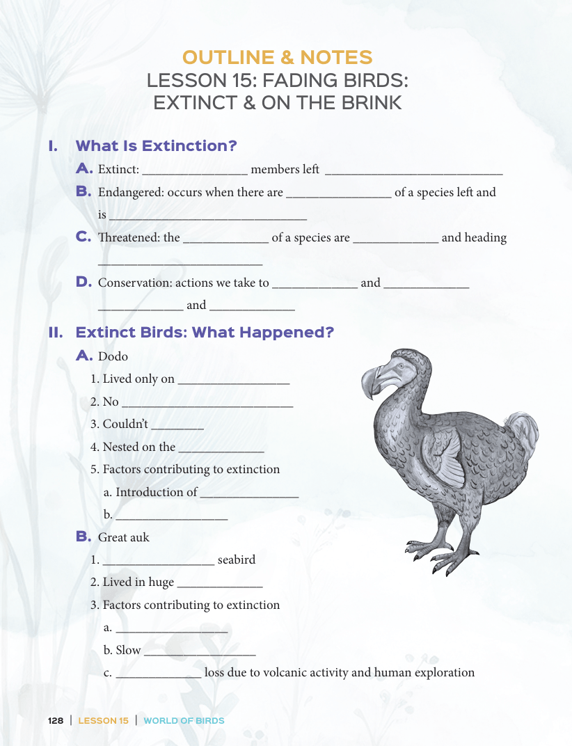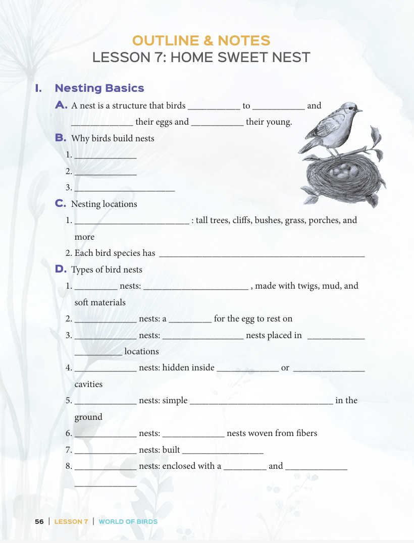This companion guide to the World of Birds middle school course includes fill-in-the-blank lecture notes for each lesson, making it easy for students follow along with the important material from the lectures.